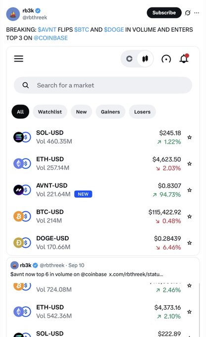 $AVNT이 오늘 @coinbase에서 가장 많이 거래되는 토큰 3위인 비트코인(BTC) 와 도지코인(Doge) 뒤집어 보는 건 정말 꿈같은 일이에요. 이 글을 보시는 모든 창업자분들께 -> 지역 사회에 관대하게 베풀어주세요. 지역 사회의 사랑은 끝이 없습니다!!
