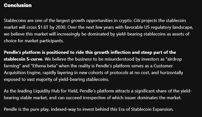 > 스테이블코인 시장 규모 2030년까지 1조 6,000억 달러 돌파 전망 > 펜들(Pendle) 이 폭발적인 성장을 타고갈 수 있는 위치에 있습니다. > 펜들(Pendle) 기본 프로토콜(및 TradFi 기관?)을 위한 "고객 확보 엔진"입니다. > 다양한 스테이블코인/자산/내러티브에 대한 다중 노출 매우 그럴 것이다 twitter.com/PendleIntern/statu...
