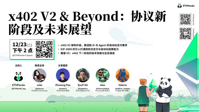 이번 Space 호에서는 x402 V2 공식 출시를 집중 조명하며, 프로토콜 아키텍처 업그레이드, EIP-3009 도입, AI/에이전트 기반 결제 및 자동 정산 등 주요 주제를 심층적으로 다룹니다. 특히 "AI 간 결제 프로토콜의 기반"으로서 x402의 최신 개발 동향을 살펴볼 예정입니다. 더 나아가, 새롭게 떠오르는 실제 응용 시나리오를 논의하고, 2025년 말에 접어드는 시점에서 2026년과 V3에서 x402가 어떻게 기술적으로 발전할지 전망해 봅니다.
