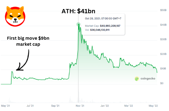 참고로 SHIB는 $3.5bn에서 $41bn까지 가는데 한 달도 안 걸렸다 (11.7배 성장).