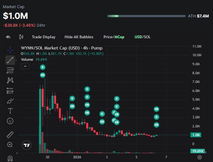 크리에이터 리워드의 100%가 $WYNN 토큰 바이백에 사용되었습니다. 저는 최대한 많이 소유할 때까지 계속해서 매수할 계획이고, 그 다음 이 오퍼레이션의 2단계로 넘어갑니다. 개발자 지갑에서 추가로 30 SOL도 방금 매수했습니다. - Wynn