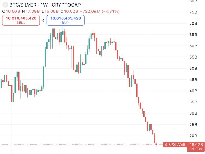 은 가격이 90분 만에 거의 1조 달러 가까이 폭락했지만, 솔직히 말해서 비트코인에 비하면 여전히 꽤 괜찮아 보이네요 😂 참고로 은과 금은 90분 만에 비트코인의 전체 시가총액을 넘어섰습니다. 이는 비트코인이 얼마나 작은 존재인지를 보여주는 사례입니다.