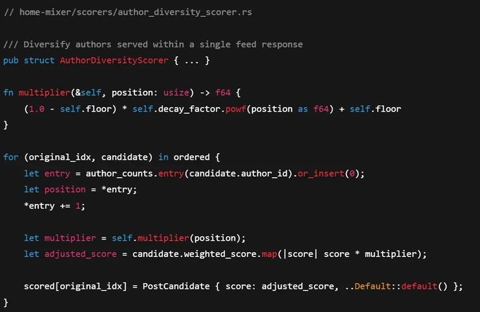 니키타는 "GM(Good Morning) 단어를 쓰지 말라고 하지만, 하루의 첫 게시물은 이후 도달 범위가 어떻게 될지 미리 보여주는 역할을 합니다. 또한 트위터에서 "GM(Good Morning) 단어를 쓰는 사람이 트위터에만 집중하는 사람보다 훨씬 많기 때문에 더 넓은 독자층에게 어필할 수 있습니다. 다양성 점수 시스템이 없다면, 활동량이 많은 계정(또는 알고리즘이 선호하는 계정)을 팔로우할 경우 피드가 해당 계정의 트윗으로 도배될 수 있습니다. 따라서 이 시스템은 한 명의 작성자가 높은 순위의 콘텐츠를 계속해서 게시하더라도 다양성을 유지하도록 설계되었습니다. ------------------------------------------------------------ 트위터가 조정할 수 있는 주요 매개변수는 다음과 같습니다. - decay_factor: 반복 저자를 얼마나 적극적으로 순위에서 제외할 것인가 - 바닥값: 최소 배율은 누군가의 10번째 트윗조차 완전히 묻히지 않도록 보장합니다. ----- 트윗의 최종 순위는 참여도 예측, 작성자와의 관계, 최근 게시 여부, 미디어 유형, 그리고 여러 가지 다양성 관련 불이익(작성자에 대한 불이익뿐만 아니라 콘텐츠 유형에 대한 불이익 포함)의 영향을 받습니다. 제 생각에는 이게 UTC 시간대를 기준으로 재설정되는 것 같은데, 아무도 정확히는 모릅니다. 오늘 벌써 일곱 번째 게시글이네요. 이제 제 '최저점'에 가까워진 건가 싶어요.