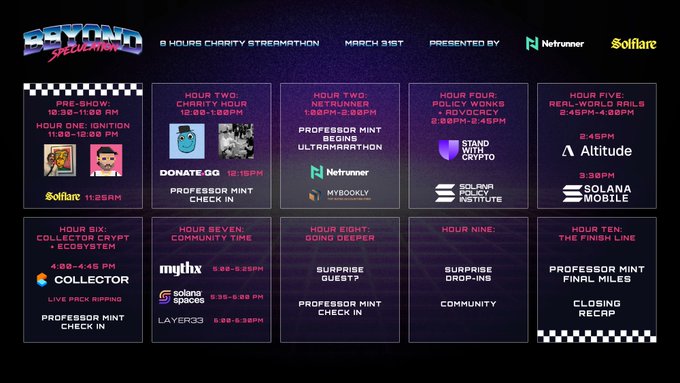 24시간 전. 내일 저희는 솔라나(Solana) SKYLINE NYC에서 Solflare와 함께 10시간 동안 라이브 방송을 진행합니다. 이 방송에는 솔라나(Solana) 만들어가는 개발자, 창립자, 그리고 팀들이 함께할 예정입니다. 실제로 제품을 만들고 꾸준히 제품을 배송하는 사람들과 진솔한 대화를 나눕니다. 지구 반대편에서는 @hash_on_hash가 뉴질랜드에서 울트라마라톤을 생중계하고 있습니다. 10시간 동안 스트리밍하는 것만으로는 부족했던 모양입니다. 모금된 모든 금액은 @donatedotgg를 통해 @standwithcrypto와 @KidsCanNZ에 전달됩니다. 💚