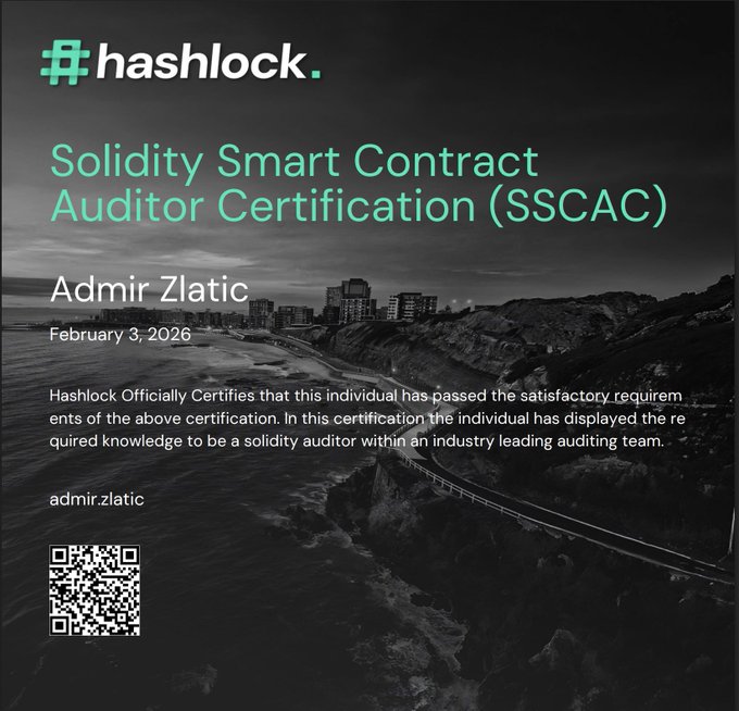 @Hashlock_ 님으로부터 솔리디티 솔리디티 스마트 계약 감사자 자격증(SSCAC)을 공식적으로 취득하게 되어 기쁘게 생각합니다. 계속 쌓아 올리세요 계속 레벨업하세요