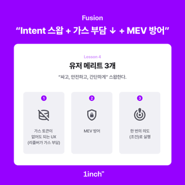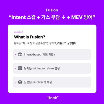 ◻️ 1inch Fusion: Intent 스왑으로 가스 부담 ↓ + MEV 방어 1inch Fusion은 유저가 “얼마를 최소로 받고 싶은지”만 정하면, 리졸버가 경쟁적으로 체결을 채워주는 Intent 기반 스왑 방식입니다. 📕 1inch Fusion에 대해 더 알아보기 : blog.1inch.com/1inch-introduce...…