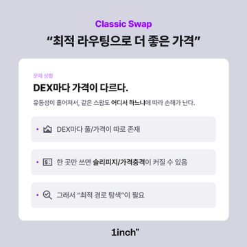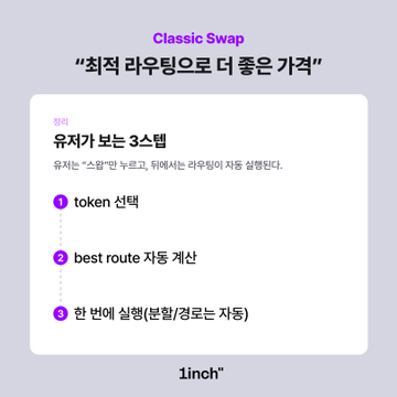 1inch Classic Swap: 최적 라우팅으로 더 좋은 가격 1inch Classic Swap은 DEX마다 흩어진 유동성/가격 차이를 한 번에 해결하기 위해, Pathfinder가 최적 경로를 자동 탐색·분할 라우팅해 더 좋은 체결을 만들어줍니다. 📕 1inch Pathfinder에 대해 더 알아보기 : blog.1inch.com/new-pathfinder-...…