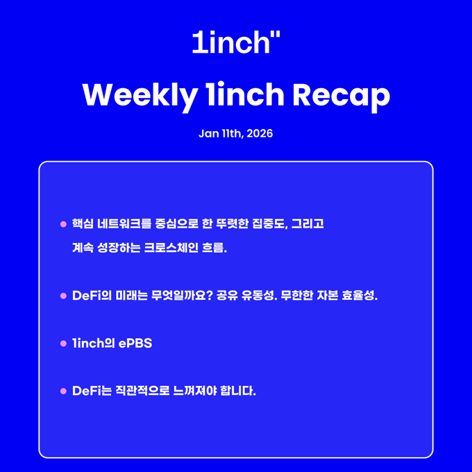 ◻️ 1inch 위클리 리캡 1월 둘째 주 ✔️ 핵심 네크워크를 중심으로 한 뚜렷한 집중도, 그리고 계속해서 성장하는 크로스체인 흐름 ✔️ Defi의 미래는 무엇일까요? 공유 유동성, 무한한 자본 효율성 ✔️ 1inch의 ePBS ✔️ Defi는 직관적으로 느껴야합니다.