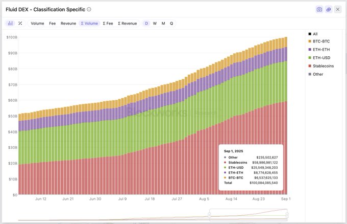 Fluid 탈중앙화 거래소(DEX) 모든 배포( 탈중앙화 거래소(DEX) Lite 포함)를 통해 평생 거래량 1,000억 달러를 돌파했습니다. 👏🌊