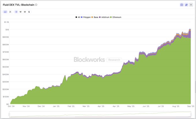 Fluid 탈중앙화 거래소(DEX) Total Value Locked(TVL) 현재 10억 달러를 넘어섰습니다. 최근 아비트럼(Arbitrum) 의 성장에 힘입어 🌊