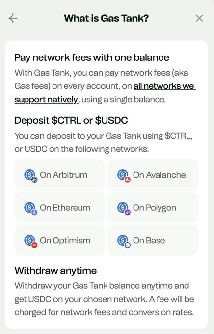 크로스 체인 스왑은 Ctrl 지갑에서 쉽습니다. 단순히 이 여섯 개의 지원되는 네트워크 중 어느 곳에서든 $CTRL 또는 $USDC로 지갑 내 가스 탱크를 충전하고 네이티브 가스 토큰 없이 스왑하세요. 가스 추상화는 미래입니다.