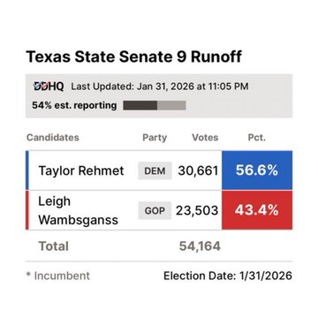 오늘 밤 텍사스에서 엄청난 정치적 지진이 일어났습니다. 민주당이 트럼프가 17%포인트 차이로 승리했던 지역구에서 주 상원 의석을 탈환했습니다. 트럼프는 직접 나서서 공화당 후보를 지지하고 지지층의 투표 참여를 독려했지만, 결국 참패를 당했습니다.