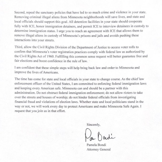 믿기 힘들겠지만 사실입니다. 팸 본디는 오늘 미네소타 주 정부 관계자들에게 서한을 보내 미네소타 주가 유권자 명부를 트럼프 행정부에 넘길 경우 이민세관집행 인터컨티넨탈 거래소) 이 주에서 철수할 것이라고 밝혔습니다. 그들은 선거 기반 시설을 장악하기 위한 협상 카드로 국가 폭력을 공공연히 사용하고 있다. twitter.com/mattmfm/status/201...