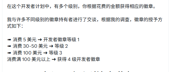 @openmind_agi 님의 인기는 예상보다 빨리 찾아왔네요. 미리 이야기해 둔 게 다행입니다... 시커폰과 다른 주요 IT 기업들의 등장으로 앱 포인트의 가치는 빠르게 희석될 것입니다. 이 시점에서 주류가 아닌 개발자의 관점을 살펴보는 것도 의미가 있습니다. 해외 개발자의 사례를 통해 알아보겠습니다. ➠5달러 지출 시 ➜ 레벨 1 개발자 배지 획득 ➠30~50달러 지출 시 ➜ 레벨 2 개발자 배지 획득 ➠100달러 지출 시 ➜ 레벨 3 개발자 배지 획득