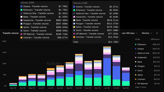 이더리움과 트론(TRON) 스테이블코인 공급량에서 앞서고 있지만, 솔라나(Solana) 이미 거래량 거래량 에서 경쟁력을 보이며 2월 한 달 동안에만 약 6,500억 달러 이상을 처리했는데, 이는 이전 최고치의 약 2배에 달하는 수치입니다.
