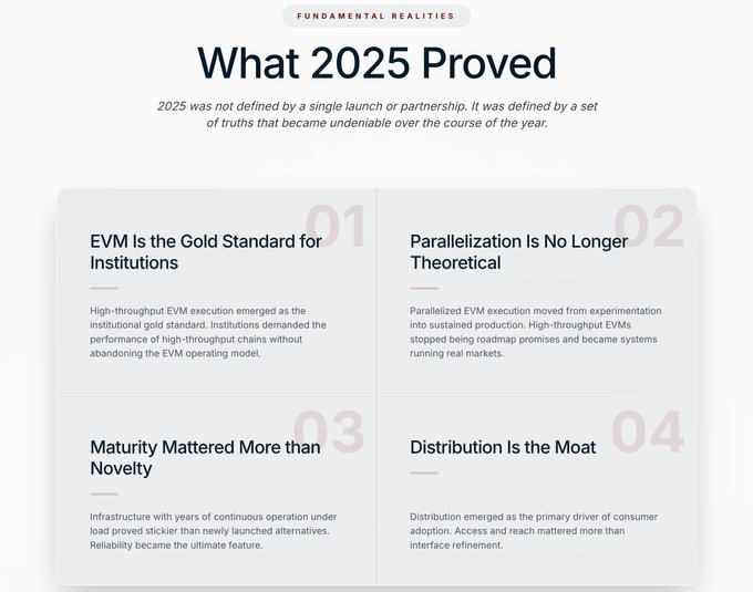 ➥ 앱토스(Aptos) 의 성과는 2026년에 더욱 성장할 것입니다 ➊ 메인넷 블록 시간 50ms 미만 달성 → 인프라가 드디어 실제 거래 및 결제에 충분히 빨라졌습니다 ➋ 스테이블코인을 핵심 결제 수단으로 활용 → 신고가 최고치인 18억 달러 경신, 거의 제로에 가까운 수수료로 앱토스(Aptos) 결제 및 정산 레이어(Settlement Layer) 으로 탈바꿈 ➌ RWA 상승세 → 신고가 인 12억 달러 돌파, BlackRock 비들(Buidl) + 사모 대출이 기관 투자에 적합함을 입증 ➍ @DecibelTrade 및 새로운 거래 기본 요소 → 항상 활성화된 글로벌 시장을 위해 설계된 대상 + 현물 ➎ @shelbyserves 데이터 인프라 → 빠른 읽기가 필요한 온체인 앱 $APT 2025년에 신뢰성 위험 제거에 소요 2026년은 인프라가 실제로 활용되는 해가 될 것 같습니다. twitter.com/Nick_Researcher/st...