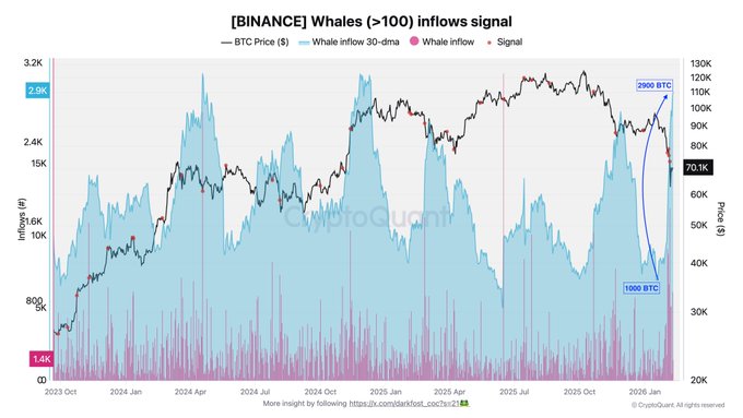 비트코인(BTC) 9만 5천 달러에서 6만 달러로 하락하자, 고래 투자자들이 바이낸스로 유입하는 월평균 비트코인(BTC) 양이 급격히 증가했습니다.