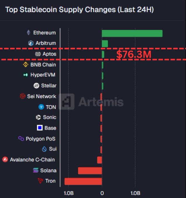 📊 상위 스테이블코인 공급량 변화 (24시간) @ 앱토스(Aptos) 7,630만 달러 유입으로 다시 3위를 차지했습니다 🔥 앱토스(Aptos) 의 총 스테이블코인 시가총액이 이제 13억 달러를 넘어섰습니다. 💵 이러한 수준의 성장은 강력한 유동성 기반이 온체인에 어떻게 형성되고 있는지 보여줍니다.⚡