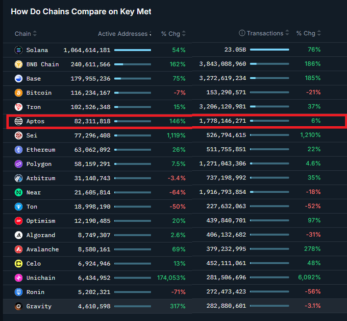 2025년, 앱토스(Aptos) 거래량 과 활성 지갑 수 기준으로 모든 블록체인 중 6위를 기록했습니다. 활성 지갑 수는 8,200만 개로 146% 증가했으며, 거래량은 18억 8천만 건으로 6% 증가했습니다.