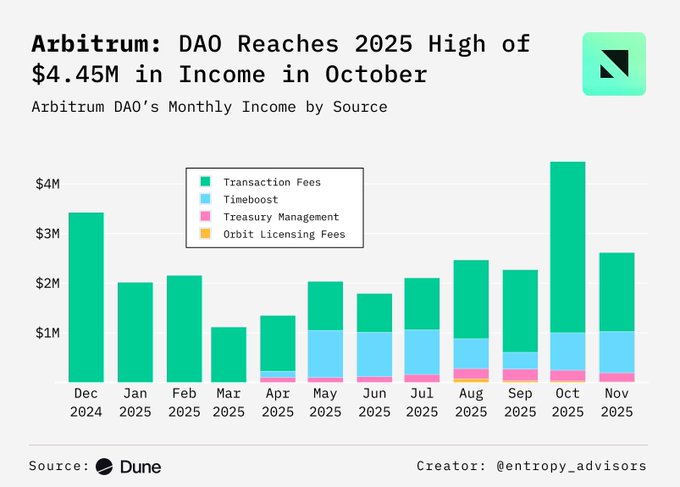 The Q4 2025 report for Arbitrum by @entropyadvisors is out. TLDR; OK quarter, not a lot to remark upon. Net income $3.6m (up 29% QoQ) Expenses $5.5m (up 40% QoQ) Treasury excluding ARB $199m (down marginally) First, it’s important to remember that Arbitrum, like many DAOs, has