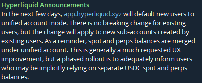 🚨@HyperliquidX는 곧 신규 사용자를 대상으로 스팟 및 무기한 잔액을 통합하는 계정 모드를 기본 설정할 예정입니다. 기존 사용자는 영향을 받지 않습니다. 사용자가 적응할 시간을 가질 수 있도록 단계적으로 적용됩니다.