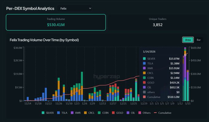 HIP-3 탈중앙화 거래소(DEX) @felixprotocol의 거래량 이 5억 달러를 돌파했습니다.
