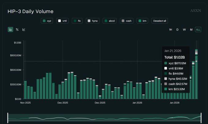 HIP-3 거래량이 24시간 만에 처음으로 10억 달러를 돌파했습니다. 총 거래량 202억 1천만 달러입니다.