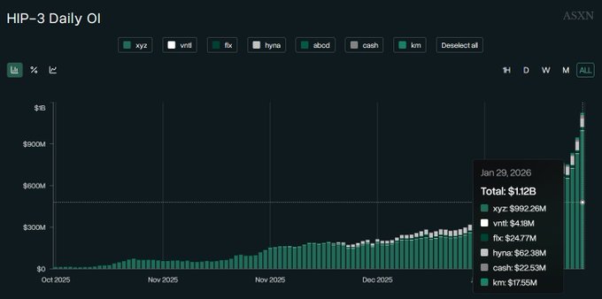 HIP-3의 미결제 약정액이 11억 2천만 달러를 넘어섰습니다. 미결제 약정액은 10일 만에 100% 증가했고, 한 달 만에 4배로 증가했습니다.