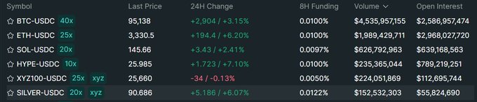 지난 24시간 동안 거래량 가장 많은 6개 쌍 중 2개는 @tradexyz의 HIP-3($SILVER)와 $XYZ-100(나스닥)입니다.