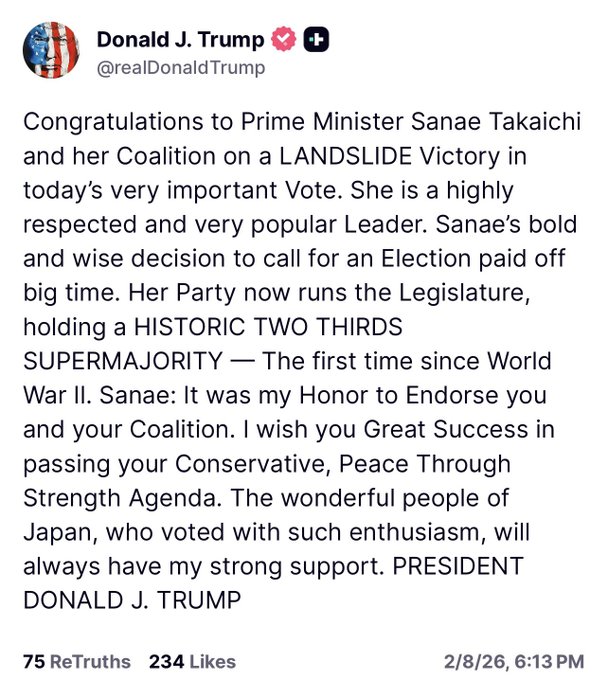 트럼프는 일본 대선 결과에 대해 분명히 매우 기뻐하고 있다.