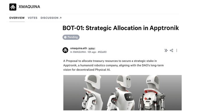 이더리움(ETH) 분산형 자율 조직(DAO)의 첫 번째 투표에 참여하고 싶다면 24시간 내에 $DEUS를 청구할 수 있습니다. 세계 최고의 로봇 기업에 대한 접근이 여기서 시작됩니다. 제안서 검토 → https://스냅샷.box/#/s:xmaquina.eth…