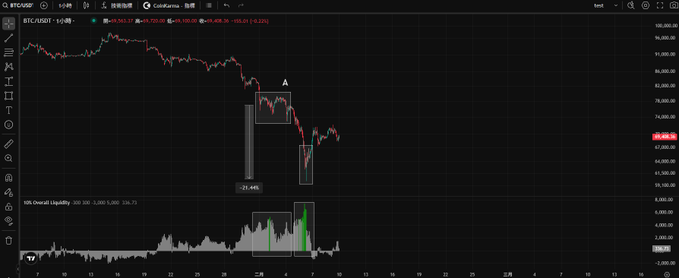 98,000 부근에서 유동성 매도 압력에 부딪힌 후 가격이 8% 이상 하락했고, 오늘 90,000선 아래로 떨어졌습니다. 전체 LIQ 지표는 이 중요한 가격대에서 다시 한번 유동성 매수를 감지했습니다. 이틀 전, 코인카르마는 98,000선에서 상당한 매도 압력이 있다고 언급하며 포지션 차익 실현을 권고했습니다. 이후 비트코인 가격은 하락하여 오늘 90,000선 아래로 잠시 떨어져 89,800선까지 하락하며 이틀 만에 8.15% 하락했습니다. 특히, 전체 LIQ 지표는 90,000 부근에서 다시 한번 유동성 매수를 감지했습니다.