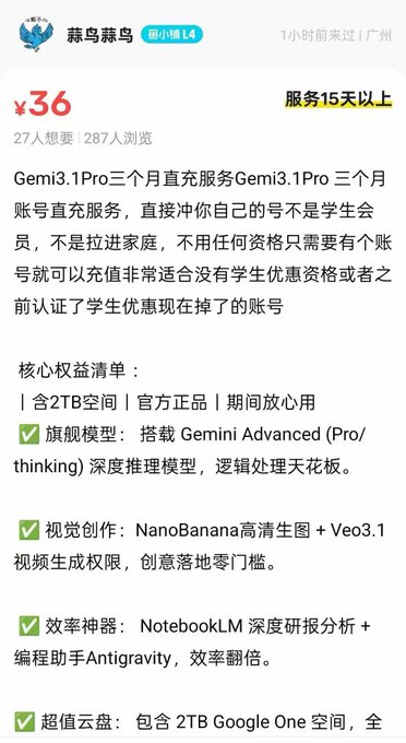 중국 온라인 마켓플레이스인 시안위(Xianyu)에서 제미니 프로(Gemini Pro) 계정을 바로 구매하세요. 저렴하고 풍족한 혜택을 제공하는 이번 기회는 밀크티 두 잔 가격으로 누릴 수 있는 놓칠 수 없는 특가입니다! 지난번에 50위안으로 제미니 3.1 프로 1년 이용권을 구매하는 글이 많은 분들의 큰 호응을 얻었는데요 🥰, 일부 분들은 계정 정지나 차단 등의 보안 문제를 우려하셨습니다. 간단히 설명드리자면, Google One의 유일한 리스크 판매자의 계정이 Google에 의해 차단될 수 있다는 것입니다. 그는 카드를 어떻게 얻었는지 몰랐다. 학생 할인이었을 수도 있고, 신용카드 사기였을 수도 있다. 하지만 초대받은 멤버들에게는 아무런 리스크 없습니다. 만약 누군가 차단되더라도, 메인 계정만 차단됩니다. 메인 계정이 차단된 후에는 패밀리를 해체하는 것도 아주 간단합니다 😆. 개인정보 유출 걱정도 하실 필요 없어요. 애플은 가족 구성원이 공유할 수 있는 대용량 iCloud 저장 공간을 제공하는데, 저는 종종 이를 구매하고 5~6년 동안 문제없이 사용하고 있습니다. 하지만 제가 구매한 매장의 사후 서비스는 꽤 괜찮습니다. 일반적인 사용 환경에서는 본전 뽑는다는 걱정은 전혀 하지 않아도 됩니다. 저를 포함한 몇몇 동료들이 두 달 동안 사용했는데, 향이 정말 좋아요! 🤤 또한 일부 사용자는 서비스가 중단될 경우 신뢰할 수 있는 판매업체가 서비스를 계속 이용할 수 있도록 다시 초대해 준다고 언급했습니다. 그래도 걱정되신다면, 그룹 멤버인 @MMMusol 님이 추천하신 직접적인 방법을 시도해 보세요. 장기적인 안정성을 중시하고 잦은 실패를 걱정하는 분이라면 고려해 볼 만한 가치가 있을 겁니다 🙌🏻. 36위안으로 3개월 공식 구독권을 직접 구매할 수 있습니다. 이전 서비스보다 1년에 50위안으로 조금 더 비싸지만, 더 안정적이고 공식 웹사이트에서 한 달에 140위안을 내는 것에 비하면 여전히 아주 좋은 가격입니다! 결제 방식: 구글 계정으로 직접 입금되며, 전체 과정은 5~10분 정도 소요됩니다. 1) Xianyu(중고 거래 앱)에서 Gemini 3.1 Pro 충전/기프트 카드를 검색하세요. 2) 가격 선택은 6유로에서 7유로 사이이며, 기간은 3개월입니다 (기프트 카드 직접 충전). (판매자는 L3 또는 L4를 선택하는 것이 좋습니다.) 3) 제품을 구매하시면 판매자가 선물 카드 링크를 보내드립니다. 4) 판매자가 제공한 은행 카드와 주소를 본인 계정에 연결하세요. 연결 과정에서 오류가 발생하면 판매자에게 알려주세요. 그들은 신속하게 처리해 줄 것입니다 (훌륭한 사후 서비스를 제공하는 평판 좋은 업체는 매우 친절한 서비스를 제공할 것입니다). 5) 선물 카드를 계정에 연결하면 모든 과정이 완료됩니다! 옵션으로는 1년 동안 사용할 수 있는 50위안 가족 초대 플랜이 있습니다. 저렴하고 혜택도 넉넉하지만, 1년이 되기 전에 계정이 정지될 가능성이 있습니다. 다른 옵션으로는 3개월 동안 사용할 수 있는 35위안 계좌 직접 충전 플랜이 있습니다. 가격은 더 비싸지만 광고 없이 안정적으로 사용할 수 있으며, 선물 공유에 적합합니다. 어떤 옵션을 선택할지는 여러분의 자유입니다! ☺️ 모두 냄새가 아주 좋아요 twitter.com/0xMilkRabbit/statu...