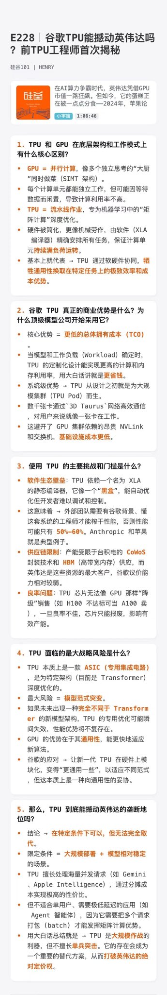 구글의 TPU가 엔비디아의 독점 체제에 도전할 수 있을까? 주말에 운동하면서 실리콘 밸리 101 팟캐스트에서 구글 TPU 엔지니어의 인터뷰를 들었는데, 굉장히 흥미로웠습니다. 청취 후, 저는 몇 가지 새로운 통찰력과 성찰을 얻었고, 원문의 핵심 관점 요약했으며, 제 생각을 기록했습니다. 1️⃣ 팟캐스트 결론 (자세한 AI 텍스트 버전 요약도 제공됩니다. 더 자세한 내용은 그림 2를 참조하십시오.) 1) 제미니는 매우 직관적이지 않은 특징을 가지고 있습니다. 사용자가 많을수록 속도가 빨라집니다. 이는 TPU 아키텍처에 의해 결정됩니다. 병렬 컴퓨팅과 재사용 가능한 캐싱 메커니즘이 결합되어 해시레이트 최대한 활용할 때 최대 효율을 달성합니다. 물론 양날의 검의 다른 면도 드러났습니다. 작년에 Gemini 3가 출시되면서 수많은 GPT 사용자가 몰려들어 서비스가 자주 다운되는 문제가 발생했습니다. 근본적인 원인은 TPU 생산 능력이 수요를 따라가지 못했고, 용량 확장이 사용자 증가 속도를 따라가지 못했기 때문입니다. 2) 엔비디아 GPU와 구글 TPU: 각각 고유의 경쟁 우위를 가지고 있습니다. 엔비디아의 강점은 소프트웨어에 있습니다. CUDA 생태계는 매우 성숙하고 다재다능하며 수정하기 어렵습니다. 구글의 TPU는 하드웨어와 소프트웨어를 결합하는 장점을 가지고 있어, 특정 대규모 모델 알고리즘을 실행할 때 엔비디아 제품을 직접적으로 능가하는 성능을 보여줄 수 있습니다. 애플은 TPU의 최대 구매업체가 되었으며, 앤스로픽사도 대량 TPU를 구매하고 있습니다. 이유는 간단합니다. 엔비디아 한 곳에 모든 것을 걸고 싶지 않기 때문입니다. 3) TSMC의 경쟁 우위는 상상 이상으로 깊다. 엔비디아든, 구글이든, 애플이든... 모든 칩은 TSMC에서 생산해야 합니다. 공정 기술과 수율 면에서 TSMC를 대체할 수 있는 회사는 없습니다. 더욱 어처구니없는 것은 TSMC의 생산 능력이 충분하지 않아 주요 제조업체들이 경쟁적으로 인수하려 한다는 점이다. 삽을 파는 것은 안전한 투자이며, 저는 TSMC 주식에 대해 낙관적인 전망을 유지하고 보유할 것입니다. 4) TPU는 알고리즘을 하드웨어에 넣는 것과 유사하며, ASIC을 이용한 채굴 과 어느 정도 비슷합니다. GPU는 범용적인 반면, TPU는 맞춤형으로 설계되었습니다. 구글의 칩 개발팀은 TSMC에 1~2년 전에 미리 주문을 넣어야 하는데, 이는 현재 생산하는 칩이 2년 후의 AI 알고리즘에 맞춰 설계되었다는 것을 의미합니다. 따라서 구글의 AI 팀과 칩 팀은 긴밀하게 통합되어야 합니다. 오늘 그들이 투자하는 알고리즘의 방향이 2년 후 칩이 실용화될 수 있을지를 결정할 것입니다. 만약 베팅이 맞으면 판도가 바뀔 수 있지만, 틀리면 2년간의 손실이 모두 헛수고가 될 수 있습니다. 이러한 제약은 엔비디아가 대면 해야 할 문제가 아닙니다. 2️⃣ 개인적인 생각 몇 가지: 소위 하드웨어와 소프트웨어 통합이라는 것은 범용 하드웨어 설계 능력이 부족하거나 비용이 너무 많이 든다는 것을 의미할 뿐입니다. 특정 유형의 알고리즘에 맞춰 하드웨어를 직접 설계하는 것이 더 나을지도 모릅니다. 하드웨어 설계 측면에서 보면 범용 하드웨어와는 비교할 수 없습니다. 엔비디아는 왜 NPU/TPU를 만들지 않나요? 그들이 가진 강점을 확장할 수 없기 때문입니다. 너무 많은 제조업체가 그렇게 할 수 있고, 모두가 그렇게 한다면 휴대폰 제조업체들처럼 될 것입니다. 예를 들면 🌰: 기본적으로 모든 안드로이드폰에는 적외선 리모컨 기능이 탑재되어 있으며, 이는 범용 리모컨 기능입니다. 애플은 왜 그렇게 하지 않을까요? 이 기능 구현이 어렵나요? 아니요, 그렇지 않습니다. 고객에게 필요가 있습니까? 네. 그렇다면 애플은 왜 그렇게 하지 않을까요? 제품의 형태가 반드시 "수요에 의해 전적으로 결정되는 것"은 아니라고 생각합니다. 두 집합이 동일한 요소 점유비율 높을수록, 두 집합을 구별하기가 더 어려워집니다. 우리가 휴대폰에 대해 갖는 인상, 즉 애플 제품과 비애플 제품에 대한 인식을 생각해 보세요. 안드로이드 사용자라면 대부분 샤오미, 오포, 비보, 화웨이에 관심이 없습니다. 제품들이 너무 동질적이기 때문에 사용자 충성도가 상대적으로 낮습니다. 계산기와 컴퓨터를 비유하자면, 컴퓨터는 일반적인 계산에 사용되고, 계산기는 특정한 계산에 사용됩니다. 이 계산기는 전력 소모가 적고 특정 계산만 수행할 수 있습니다. TPU는 엔비디아의 GPU와 같은 하드웨어 설계 장벽이 없습니다. 저희는 비용을 절감할 방법을 찾고 있을 뿐입니다. 동시에, 비용 절감만으로 큰돈을 버는 기업은 극히 드뭅니다. 새로운 개념을 제시하고 새로운 방향을 개척하는 기업만이 성공할 수 있으며, 이러한 기업들은 과대광고의 대상이 되기 쉽습니다. 현재 신경망 연산은 주로 텐서 연산을 포함합니다. 엔비디아에게 비용 절감은 최후의 수단입니다. 그러므로 TPU가 주장하는 장점만을 살펴보는 것은 적절하지 않습니다. 구글의 관점에서만 보면 TPU를 만드는 것이 최선의 선택입니다. 하지만 엔비디아의 관점에서 볼 때, 가격 경쟁에 뛰어드는 것은 좋지 않은 전략입니다. 엔비디아는 이미 선발 주자로서의 이점을 확보했고, 