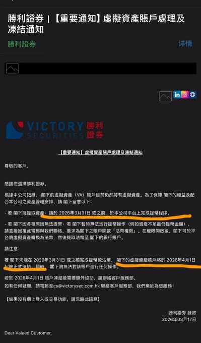 빅토리 시큐리티스가 계좌 청산을 시작했다는 이메일을 방금 받았습니다. 앞서 폐점을 발표했었고, 더 이상 거래는 불가능하며 현금 인출만 가능하다고 합니다. 오늘 발송된 이메일은 모든 사용자의 가상 자산 계정이 4월까지 폐쇄될 예정임을 다시 한번 사용자에게 알렸습니다. 특별 알림 👇🏻 2026년 3월 31일 이전에 계정에 가상 자산이 남아 있지만 출금이나 기타 작업을 완료하지 않은 경우, 2026년 4월 1일 이후에는 이 계정에 대해 더 이상 어떠한 조치도 취할 수 없습니다. 이로써 한때 합법적이었던 코인업계 자금 인출 방식이 완전히 사라졌습니다. 👋 twitter.com/0xMilkRabbit/statu...