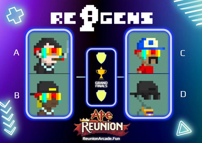 저희는 @re_generates 브래킷의 준결승전으로 곧바로 진출했습니다 우승자는 @ReunionArcade의 미니 게임 '에이프(Ape)의 아버지를 찾아서'에 통합될 것입니다 아래에서 누가 될지 투표해주세요!!!