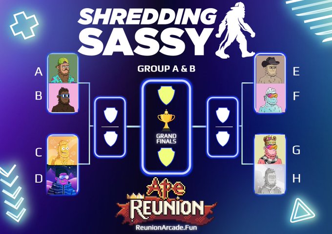 2일차 @ShreddingSassy 브래킷 우승자는 @에이프(Ape) 리유니언 커뮤니티에서 제작한 미니게임인 '에이프파더 찾기'에 자신의 Sassy를 통합하게 됩니다. 남은 Sassy들에게 행운을 빕니다. 다가오는 토너먼트를 위해 연습해 보는 것이 좋을 것 같네요 👀 http:/ReunionArcade.fun