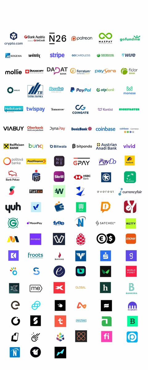 Raiffeisen Bank, Bank Austria, Monese Bank, Ferratum Bank, Austrian Anadi Bank, N26 Bank, Revolut Bank, Holvi Bank, Fidor Bank, Kontist Bank, Deniz Bank, Hello Bank, Tatra Bank, Oberbank, BUNQ, Tomorrow Bank, Dadat Bank, Paysera Bank, Viabuy, OTP Bank, Bank of Georgia, Sberbank (HU), TransferWise, Bitwala, PayPal, GoFundMe, Kickstarter, Stripe, Bitpanda, Go Cardless, Maxpay, Mollie, Patreon, Coinbase, Coinbase Commerce, Coingate, 부다페스트 은행, Postova Banka, Postfinance, Postbank, Pekao Bank, Polski Bank, Skrill, BNP Paribas, Smartbroker, Wirex, Donnationalerts, Moonpay http:/free.at, Erste Bank, Volksbank, Genome, Trastra, Olkybank, Ruut, Wallester, WorldFirst, 3SMoney, MEDirect, Global Konto, Bankera, Everestcard, Gemini, Kraken, Sumup, Bitstamp, Deblock, Bilder(lings), Payrexx, Novalnet.