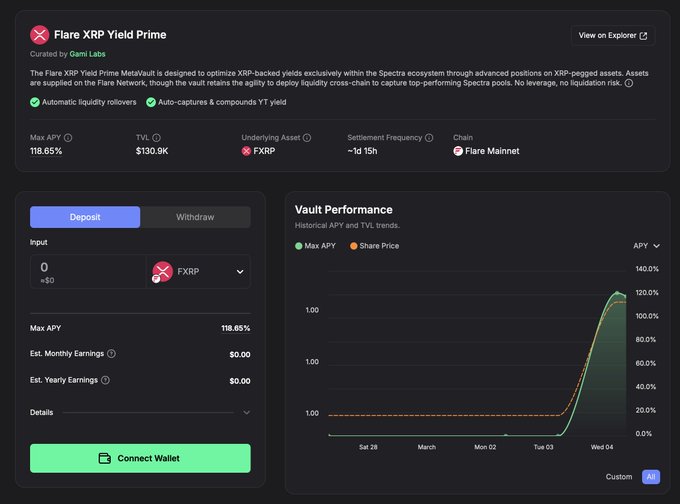 Upshift의 earnXRP와 Spectra의 Metavault를 간단히 설명하자면 다음과 같습니다. 🟢 upshift_fi에서 XRP를 획득하세요 • FXRP용 범용 수익률 저장소 • 대출, 유동성 및 성과 보수 전략 전반에 걸쳐 자본 투입됨 • DeFi 포지션을 관리하지 않고 다양한 리플(XRP) 수익률을 원하는 사용자를 위해 설계되었습니다. 🟢 플레어(Flare) 리플(XRP) Yield Prime MetaVault @spectra_finance • 스펙트라 풀 생태계에 맞춰 설계되었습니다 • 유동성 공급자(LP)를 위한 유동성 배치, 풀 롤오버 및 YT 캡처를 자동화합니다. • 기본 진입 토큰으로 FXRP를 사용하며 stXRP도 허용합니다. --- 요약(TLDR) Upshift earnXRP = 다양한 리플(XRP) 수익률 금고 Spectra MetaVault = 자동화된 Spectra 유동성 공급자(LP) 전략 서로 다른 전략 — 둘 다 $XRP이 DeFi에서 할 수 있는 일을 확장하는 것입니다.