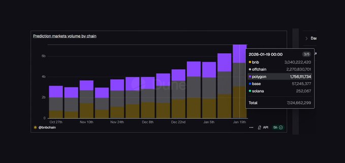 예측 결과가 @BNBCHAIN에 큰 타격을 입혔습니다. 데이터에 따르면 바이낸스 코인(BNB) 체인의 거래량 최근 며칠 동안 1위를 차지하며 선두를 달리고 있습니다. 순위는 다음과 같습니다. + 바이낸스 코인(BNB) 체인: 30억 4천만 달러 + 폴리곤(Polygon) : 17억 5천만 달러 기본 금액: 5720만 달러 또한 바이낸스 코인(BNB) 체인의 거래량 오프체인 거래량 보다 약간 더 높습니다. 대부분의 거래량 @predictdotfun에서 발생합니다. 대부분의 예측 거래량 플랫폼 자체에서만 발생하기 때문에 바이낸스 코인(BNB) Chain은 이를 온체인에 저장하는 방식을 택했고, 이것이 바이낸스 코인(BNB) Chain의 거래량 상위권을 차지하는 이유입니다.
