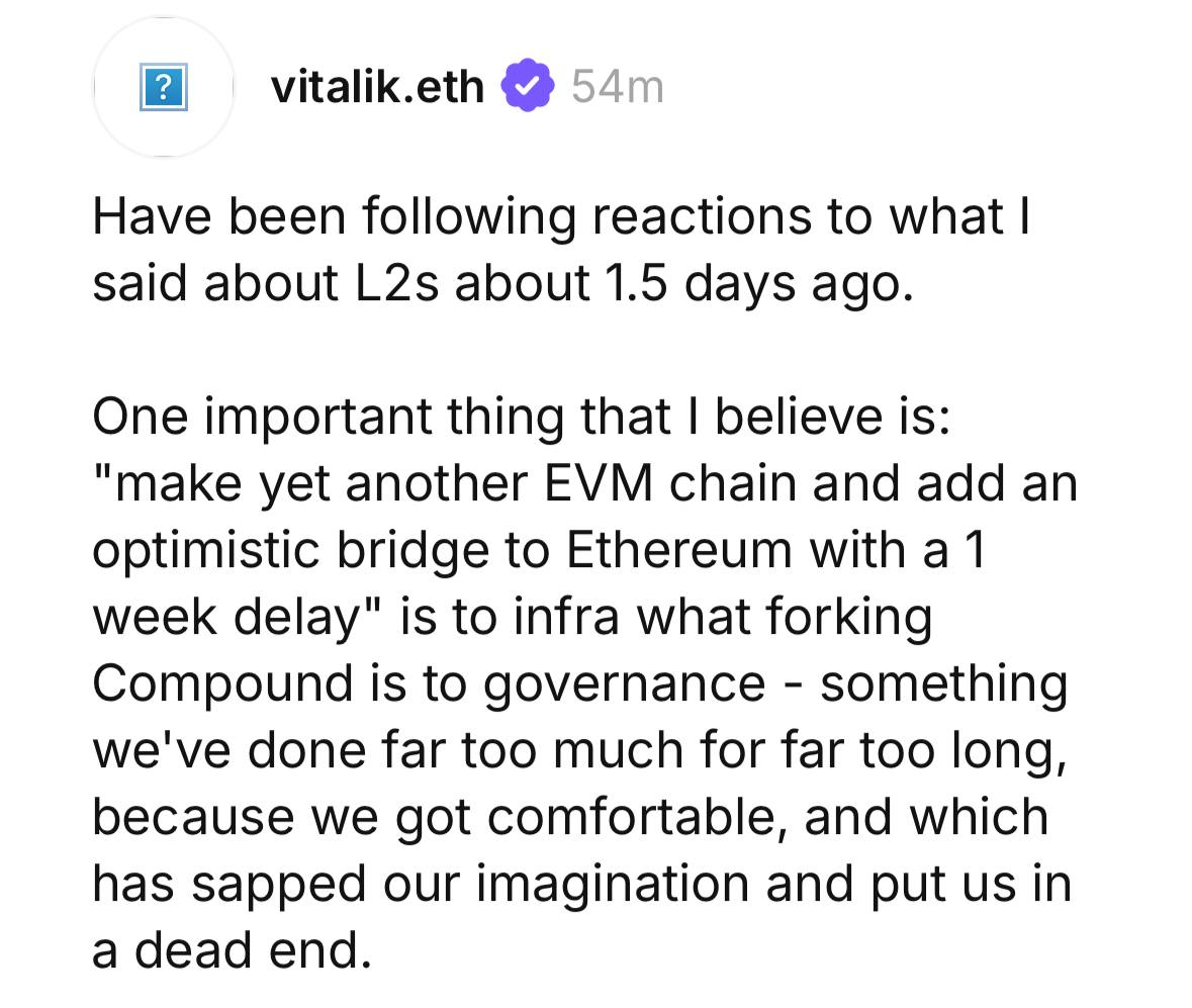 비탈릭 부테린은 이더리움 L1이 확장성이 뛰어나고 충분한 블록 공간을 제공할 것이므로 더 이상 복사 붙여넣기식 EVM 체인이나 L1이 필요하지 않다고 주장함.