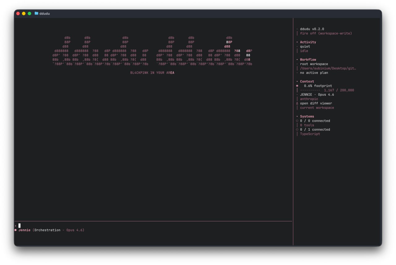 주말동안 머릿속에 떠오른 컨셉이 있어서 재밌게 AI coding CLI를 하나 만들어보고 있습니다. 아래 이미지가 시작시 인터페이스입니다. 이름하여 DDUDU DDUDU~ 혼자서 흥얼거리다가 생각났어요.