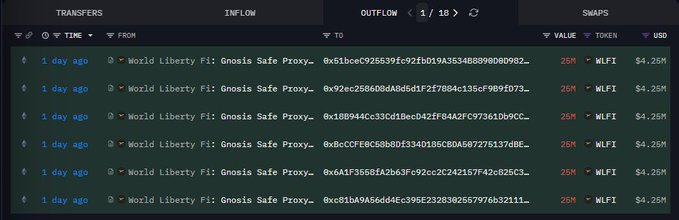 와, @worldlibertyfi는 투표가 끝나자마자 미화 1달러 증가를 위해 미화 5% 미만의 트레져리 보유량을 활용하기로 결정한 후 바로 행동에 나섰네요! 그들은 즉시 총 1억 5천만 달러(2,552만 달러)를 아래 6개의 다른 주소로 분산 배분했습니다. twitter.com/BrodieCapital/stat...