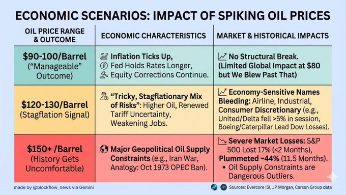 배럴당 90~100달러 이상: 관리 가능한 수준. 인플레이션이 서서히 상승하고, 연준은 매파적인 기조를 유지하며, 시장은 흔들리겠지만 구조적인 붕괴는 없을 것이다.