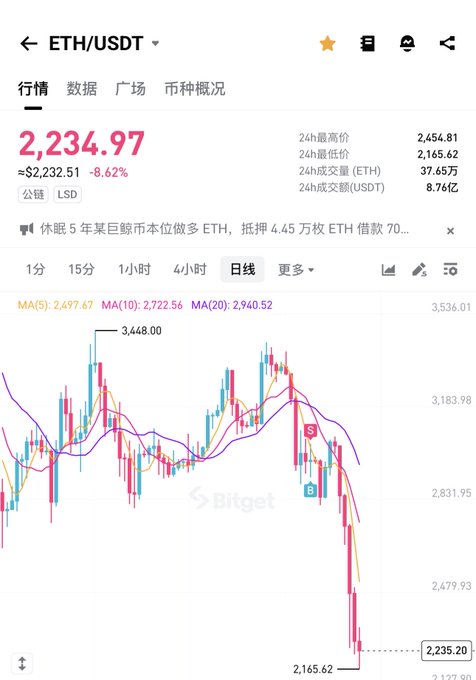 바닥은 전혀 보이지 않습니다. 시장은 이씨의 파산을 향해 직진하고 있습니다. 이씨의 최초 마진콜 가격은 약 2200이었습니다. 만약 그가 레버리지를 일부 매도하지 않았다면 지금쯤 완전히 파산했을 겁니다! 처음 레버리지를 인하했을 때 청산 가격이 약 1800까지 떨어졌는데, 아마도 불안감을 느꼈는지 다시 레버리지를 인하했습니다. 두 번째 인하에서는 청산 가격이 약 1500까지 떨어졌습니다. 이 회장은 3일 동안 게시물을 올리지 않았는데, 이는 매우 이례적인 일입니다. 최근 상당한 압박을 받고 있는 것 같습니다! 어쩌면 이는 수익과 손실이 같은 원인에서 비롯된 경우일지도 모릅니다. 예전에는 이더리움 가격이 저점매수 (바텀피싱) 쳤을 때 매수해서 큰 수익을 냈지만, 지금은 이더리움 롱 포지션을 취했다가 두 번째로 큰 손실을 봤습니다. 이렇게 왔다 갔다 하는 데 시간만 허비했네요... twitter.com/BTC521/status/2018...