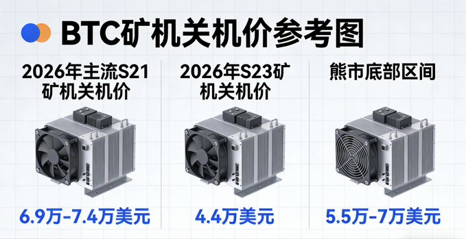 미래에 대한 믿음을 잃고 현재의 경기 침체에 대한 두려움에 사로잡혀 있다면, 이 기사를 반드시 읽어보세요! 2026년 주력 제품인 S21의 최종 가격은 69,000~74,000위안(0.08달러/kWh)이었지만, 44,000위안으로 책정된 S23은 가격 경쟁력에서 최고 자리를 차지했습니다. 두 차례 베어장 (Bear Market) 바닥은 결국 셧다운 가격에서 무너질 것이라는 사실이 확인되었습니다. 오늘날 기관 투자 유입과 해시레이트 반복적인 증가로 편차가 5~10%로 좁혀졌으며, 바닥은 55,000~70,000에 고정되었습니다! 3200에서 15500, 그리고 55000 이상까지 상승하며 바닥이 점차 높아졌고, 저점매수 (바텀피싱) 입니다! 😍😍😍 twitter.com/BTC521/status/2019...