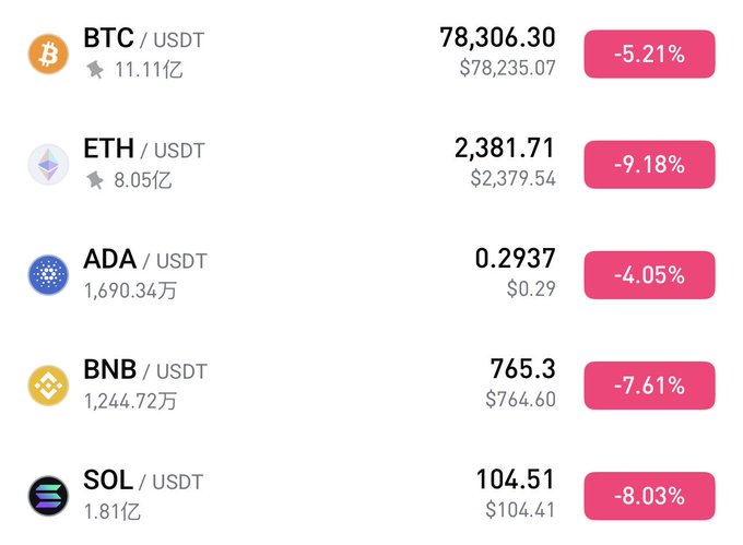 떨어지게 놔둬! 떨어지게 놔둬! 이미 8만 아래로 떨어졌는데, 조금 더 떨어져도 상관없어. 어떤 알트코인들은 비트코인만큼도 떨어지지 않았는데, 이건 정말 말도 안 돼! 죽어라! 조금 더 떨어져도 상관없어. 난 관망할 거야. 큰 기회가 올 때까지 섣부른 움직임은 없을 거야. 내 이전 거래 스타일이 맞았어: 단기 거래, 수익 실현 후 손절매, 손실은 빠르게 줄이는 거. 그 방식이 효과적이었지. 불행히도, 너무 낙관적으로 생각해서 원칙을 지키지 않았더니 시장이 또 나에게 교훈을 주었네… 이런 상황에서는 바닥을 치고 나서 큰 반등이 일어나 사람들에게 희망을 줄 수도 있고, 아니면 그냥 폭락해서 멈출 수도 있어. 어떻게 될 것 같아? twitter.com/BTC521/status/2017...