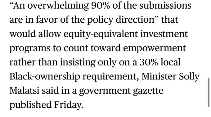그러니까 남아프리카 공화국이 일론 머스크가 흑인이 아니라는 이유로 스타링크 운영을 허용하지 않는다는 게 사실인가요? 최소 30%의 지분은 흑인이 소유해야 한다네요. 전 일론이 과장하는 줄 알았는데… 진짜였군요! 와우