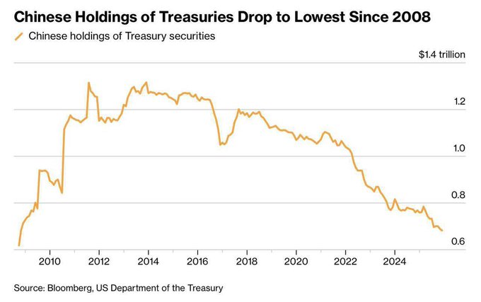 🚨 중국의 미국 트레져리 보유량이 2008년 금융위기 이후 최저 수준으로 떨어졌습니다.