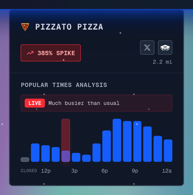 펜타곤에서 2.2마일 떨어진 피자토 피자(Pizzato Pizza)의 이용량이 수요일 오후 기준 385%라는 극심한 급증세를 보이고 있습니다. DEFCON 레벨은 4입니다.